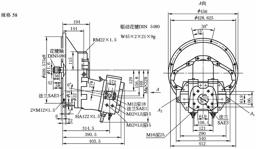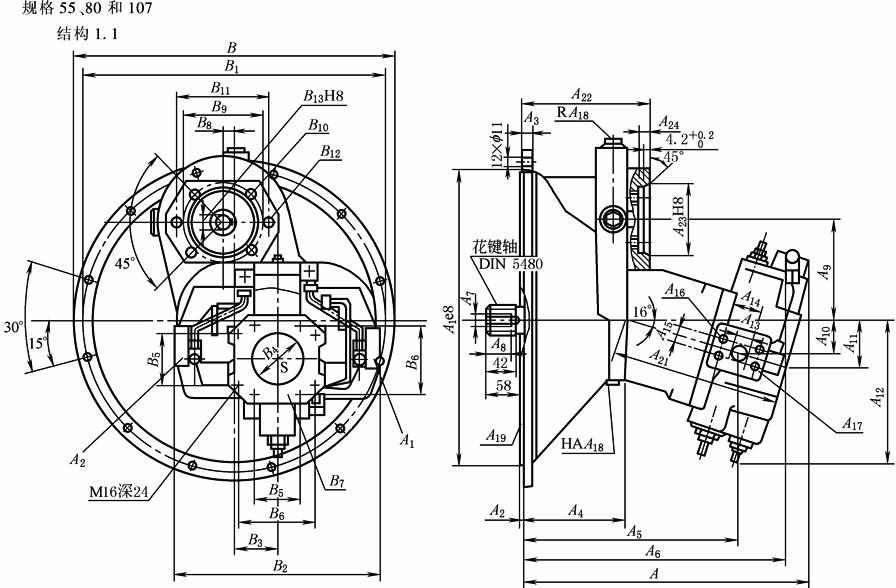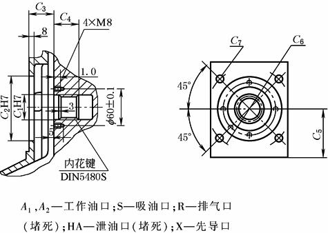 A1,A2—工作油口M33×2;S—吸油口SAE2 21MPa; R—排气口M14×1.5(堵死);HA—泄油口M14×1.5(堵死) |
