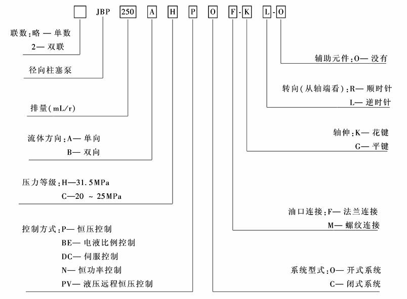 JBP径向柱塞泵为机电控制式变量泵,采用新的静压平衡技术与新材料技术,克服了转子抱轴和滑靴与定子摩擦副的胶合现象。该系列产品具有工作压力高,噪声低,寿命长、抗冲击能力强等特点,并具有多种高效节能的控制方式,主要控制形式有恒压控制、电液控制、恒功率控制,伺服控制等。该产品适用于矿山机械、化工机械、冶金机械等中高压液压系统。 型号意义: