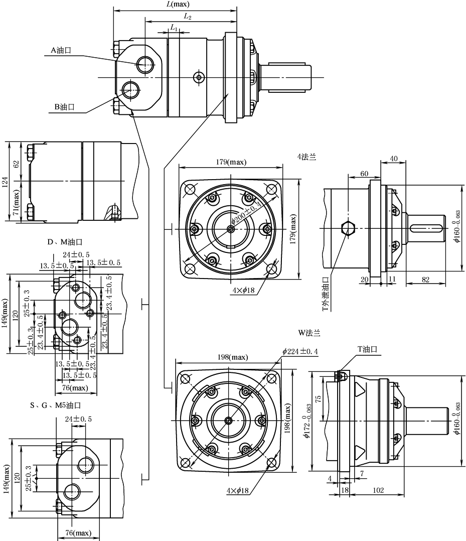注:1.额定转速、转矩是指在额定流量、压力下的输出值。 2.连续值是指该排量马达可以连续工作的最大值。 3.断续值是指该排量马达在1min内工作6s的最大值。 4.峰值是指该排量马达在1min内工作0.6s的最大值。 |