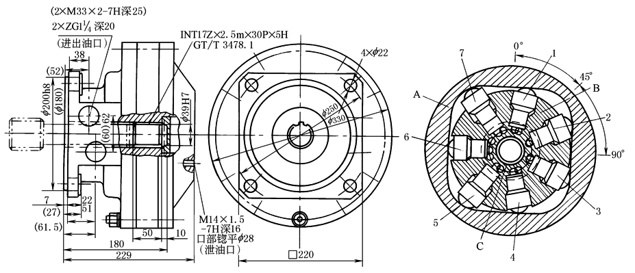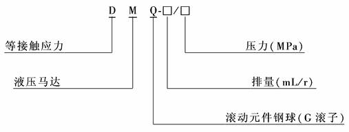 DMQ系列径向柱塞马达DMQ系列液压马达为等接触应力、低速大转矩液压马达。它可正反两个方向旋转,技术参数不变,进出油口可互换,并用两台相同型号的液压马达组成双输出轴的液压马达驱动器。该系列马达压力高、转矩大。噪声低、效率高。其工作原理见下表中图。马达工作时,压力油由入口进入,经过配油盘C分配至四个配油孔内,在图示位置时,与缸体B的1号、3号、5号配油孔连通,压力油进入对应的缸体缸孔,推动1号、3号、5号活塞组件沿着滚道环A的轨道0°~45°上作升程运动,活塞组件对轨道产生作用力,而轨道对活塞组件产生反作用力,该反作用力的切向分力又作用于缸体B,由此驱动缸体旋转产生转矩,通过传动轴输出。活塞组件1号在升程工作至45°时,进油结束,当进入45°~90°时,缸体缸孔1号与配油盘C的回油孔(低压腔)接通,开始进入轨道的回程运动,至90°时,活塞组件1号回程工作结束。至此,活塞组件1号的一个作用(升、回程)全部结束,再进入下一个作用。其余活塞组件工作类推。回油路线:低压油经配油盘C的回油孔、马达出口流至油箱。 型号意义: