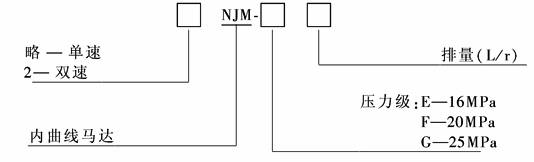 NJM型内曲线马达是多作用横梁传动径向柱塞低速大转矩马达。它具有结构紧凑、效率高、转矩大、低速稳定性好等优点,一般不需要经过变速装置而直接传递转矩。NJM型内曲线马达广泛用于工程、矿山、起重、运输、船舶、冶金等机械设备的液压系统中。 型号意义: