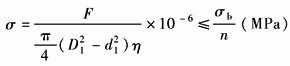卡环连接的缸筒 p —— 缸内最大工作压力,MPa D1 —— 缸筒外径,m d1 —— 焊缝底径,m F —— 缸内最大推力,N η —— 焊接效率,取η=0.7 σb —— 焊条材料的抗拉强度,MPa n —— 安全系数,参照缸筒壁的安全系数选取