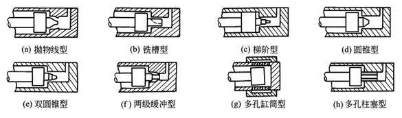 变节流缓冲装置在缓冲过程中通流面积随缓冲过程的变化而变化,缓冲腔内的缓冲压力保持均匀或按一定的规律变化,能取得满意的缓冲效果,但只能适应一定的工作负载和运动情况,其结构也比较复杂,生产成本高,因此这类缓冲装置多用在专用液压缸上 图a为抛物线柱塞,凹抛物线形缓冲柱塞最理想,可达到恒减速度,而且缓冲腔压力较低而平坦,但加工需用数控机床,成本高 图b~图f等形状都是从加工方便出发,尽量接近于凹抛物线,降低缓冲腔压力的峰值,但缓冲腔压力仍有轻微的脉冲,这对于有高精度要求的场合(如高精度机床的进给)仍有不利之处 图g、图h为多孔缸筒或多孔柱塞型,可适当布置每排小孔的数量和各排之间的距离,使节流面积更接近于理想抛物线。这种形式的加工可用普通机床进行,缓冲腔压力基本接近理想曲线 |
