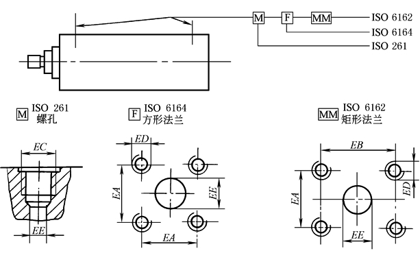 16MPa中型系列 (ISO 8136) | 缸内径 D | EC | EE (最小) | 方形法 兰名义 规格DN | EE