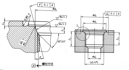 螺纹① (d1×P) | d2 | d3② 参考 | d4 | d5 +0.1 0 | L1 +0.4 0 | L2③ min | L3 max | L4 min | Z/(°) ±1° | |