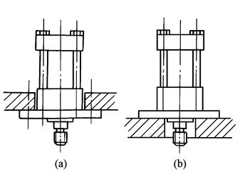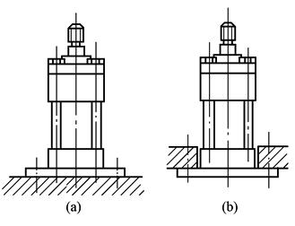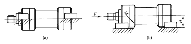 d.脚架安装:如图3所示,前端底座需用定位螺钉或定位销,后端底座则用较松螺孔,以允许液压缸受热时,缸筒能伸长,当液压缸的轴线较高,离开支承面的距离H(见图3b)较大时,底座螺钉及底座刚性应能承受倾覆力矩FH的作用。