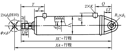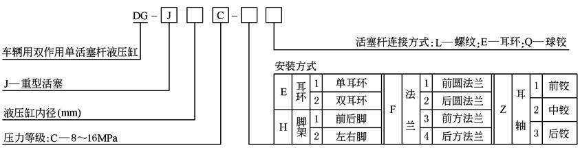 DG型车辆用液压缸是双作用单活塞杆、耳环安装型液压缸,主要用于车辆、运输机械及矿山机械等的液压传动 (1) 型号意义: