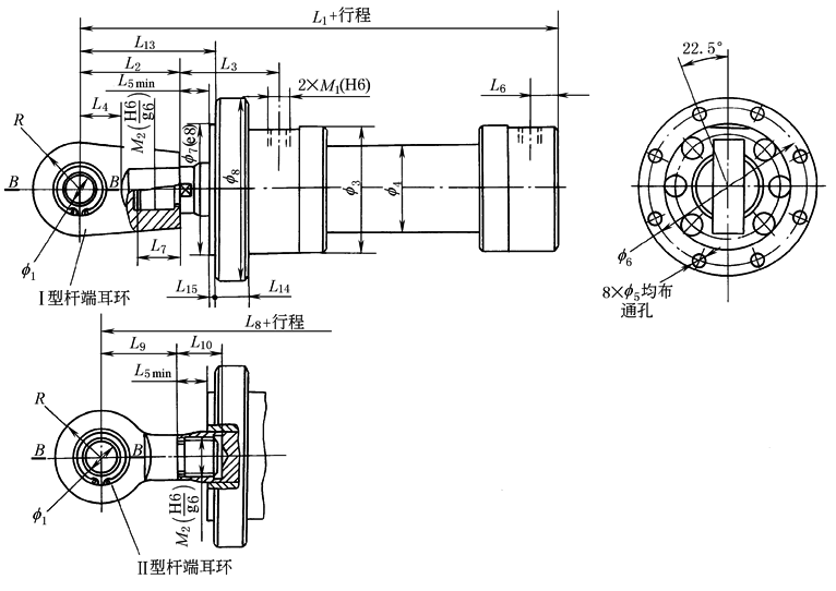注:B—B断面图及其他尺寸代号数值与中部摆动式(ZB)液压缸相同,表中部摆动式(ZB)液压缸外形尺寸。 |