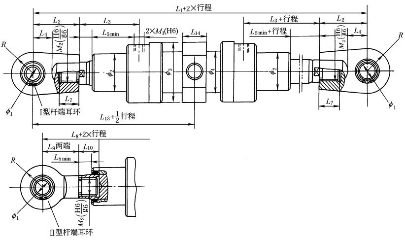 注:左视图及其他尺寸代号数值与中部摆动式(ZB)液压缸相同,见表中部摆动式(ZB)液压缸外形尺寸。 |