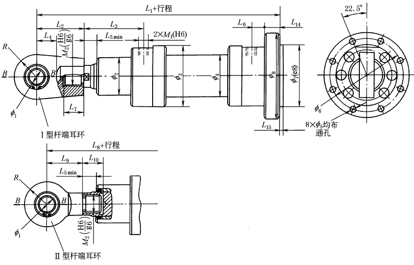 注:B—B断面及其他尺寸代号数值与中部摆动式(ZB)液压缸相同,见表中部摆动式(ZB)液压缸外形尺寸。 |
