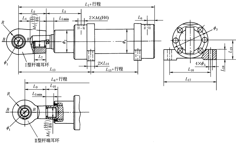 注:B—B断面及其他尺寸代号数值与中部摆动式(ZB)液压缸相同,见表中部摆动式(ZB)液压缸外形尺寸。 |