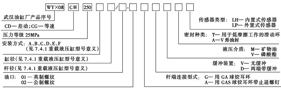 由武汉油缸厂在重载液压缸基础上设计、研制的带位移传感器的液压缸,可以在所选用的行程范围内,在任意位置输出精确的控制信号,是可以在各种生产线上进行程序控制的液压缸 (1)型号意义