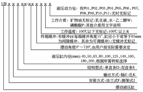 标记示例:法兰连接,轴输出,双齿条结构,转矩8818N·m,摆动角度368°,带终端缓冲和带P05液压动力包的UB型摆动液压缸,标记为 UBFZS80-368°HP05 |