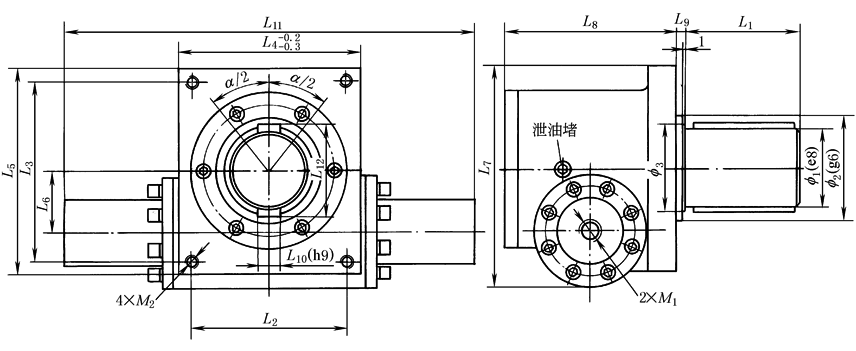 注:1.α为摆动角度,由客户按要求决定(0°~720°范围内,摆角公差α±1°)。如需更高精度或需摆角微调,请在订货时说明。 2.视图上双平键位置表示此位置的双平键轴可向左右各转动二分之一摆角。 |