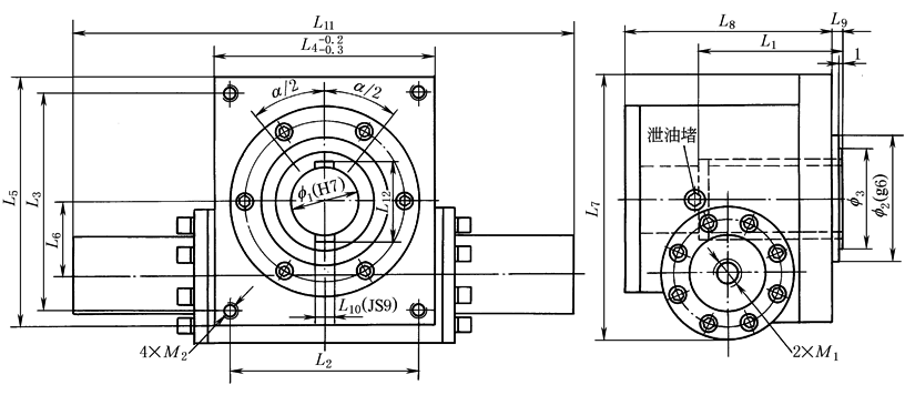 注:1.α为摆动角度,由客户按要求决定(0°~720°范围内,摆角公差α±1°)。如需更高精度或需摆角微调,请在订货时说明。 2.视图上双平键位置表示此位置的双平键孔可向左右各转动二分之一摆角。 |