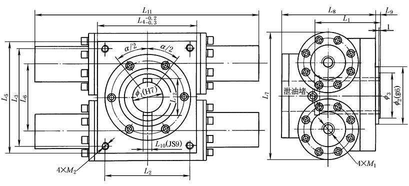 注:1.α为摆动角度,由客户按要求决定(0°~720°范围内,摆角公差α±1°)。如需更高精度或需摆角微调,请在订货时说明。 2.视图上双平键位置表示此位置的双平键孔可向左右各转动二分之一摆角。 |