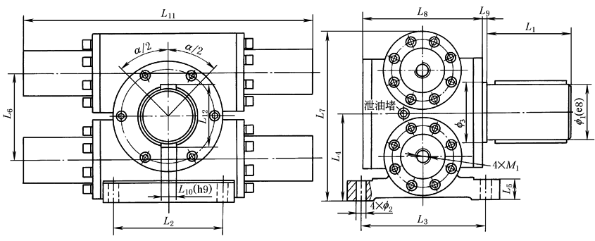 注:1.α为摆动角度,由客户按要求决定(0°~720°范围内,摆角公差α±1°)。如需更高精度或需摆角微调,请在订货时说明。 2.视图上双平键位置表示此位置的双平键轴可向左右各转动二分之一摆角。 |