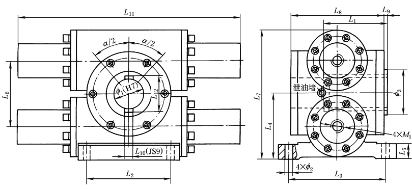 注:1.α为摆动角度,由客户按要求决定(0°~720°范围内,摆角公差α±1°)。如需更高精度或需摆角微调,请在订货时说明。 2.视图上双平键位置表示此位置的双平键孔可向左右各转动二分之一摆角。 |
