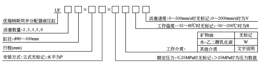 同步分配器液压缸是一种单活塞杆多活塞液压缸,所有活塞的行程、速度完全相同。同步分配器液压缸产品有等容积(UF)和非等容积(UFT)两种系列。等容积同步分配器液压缸(以下简称UF缸)的所有活塞直径相同,因此各腔排量也相同;非等容积同步分配器液压缸(以下简称UFT缸)的各腔活塞直径不同,因此各腔排量也不同(排量大小根据用户需要) UF缸和UFT缸可以实现同型或不同型的单、双作用液压缸及摆动缸之间的同步或同时完成动作(各液压缸从启动到停止的时间相同)。加装单向阀的UF缸也可以作为定量注液器使用 UF缸和UFT缸系统的同步精度不受系统的压力、流量和载荷等各种因素影响。从理论上讲同步分配器液压缸是可以实现完全同步的一种分配器,该功能是调速阀、分流集流阀或同步马达不能实现的。由于原则上不存在同步误差,因此在要求同步的各只液压缸上无需使用各种传感器,并进行检测、比较、跟踪,也无需采用价格较高的伺服或比例控制系统。当然若要求同步的数只液压缸,还同时有速度、力、位置等参数的伺服或比例控制要求,这时可采用一只内置或外置传感器的UF缸。UF缸和UFT缸不适用于内泄漏量较大的液压缸的同步控制 UF缸和UFT缸由优瑞纳斯液压机械有限公司生产。该公司可提供包括同步分配器液压缸和液压系统在内的全套同步液压装置 (1) 型号意义