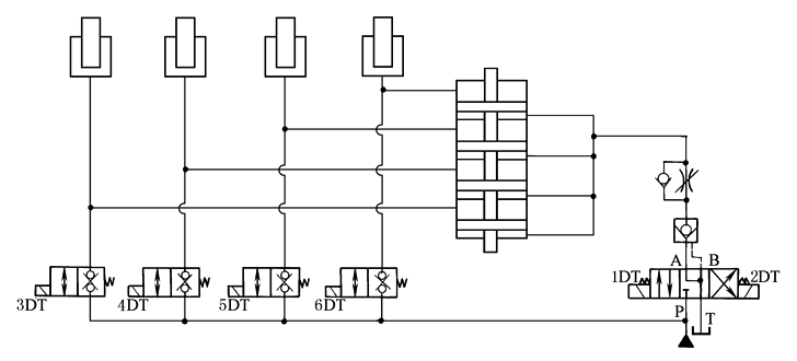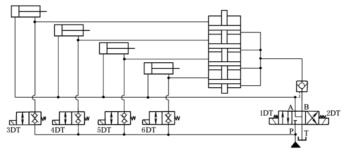 图1 柱塞缸同步回路 当1DT(图1)得电时三位四通电磁阀换向,压力油进入同步缸四个下腔,推动四个活塞向上运动,将等量介质分别输入四个柱塞缸,四个柱塞同步升起。电磁铁1DT失电,换向阀复位,柱塞缸停止运行。UF缸下腔油被液控单向阀锁定,柱塞不会下降。2DT得电,换向阀换向,液控单向阀打开,由载荷形成的压力使UF缸活塞向下运动,介质经节流阀节流后回油箱,四个柱塞同步下降。为防意外,每个柱塞缸都安装了一个补油两位两通阀,该阀必须为无泄漏阀。该阀由安装在柱塞缸上升终端前(具体数值根据同步误差要求确定)的行程或接近开关操纵。例如,当要求同步精度不低于2mm时,则在柱塞缸行程终端前1.5mm处各安装一个行程开关,当有的缸已到达行程终点,而有的缸尚未触动行程开关时,便由系统发出声光报警并使两通阀电磁铁得电,两通阀换向,压力油直接进入该液压缸,使其达到行程终点。当出现报警信号时应及时排除故障,故障可能由以下原因造成:管路、接头外泄漏;柱塞缸外泄漏;补油阀内、外泄漏;UF缸内、外泄漏 例2 四只双作用活塞缸的同步回路(图2)