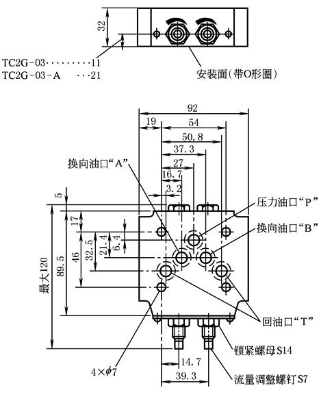 图4 TC2G-03 TC2G-03-A型外形尺寸 注:2个回油口“T”中,标准底 板用左侧口,但也可以用任意一个口 |