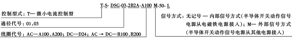 本阀可以用微小电流(10mA)来控制阀的动作,以便实现信号控制和程序控制。技术参数、外形尺寸、安装底板参见DSG-01/03电磁换向阀 型号意义: