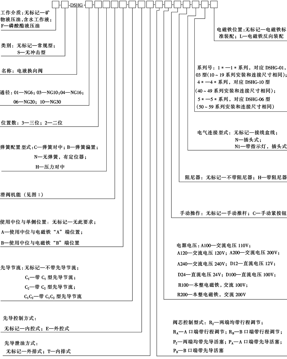DSHG型电液换向阀由电磁换向阀(DSG-01型)和液动换向阀(主阀)组成,用于较大流量的液压系统 型号意义: |