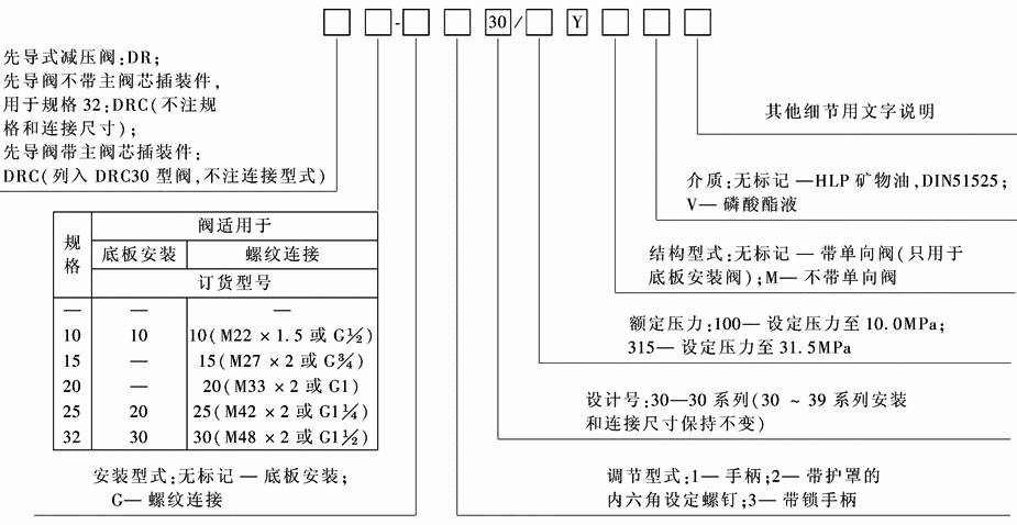 该阀主要由先导阀、主阀和单向阀组成,用于降低液压系统的压力。 型号意义: