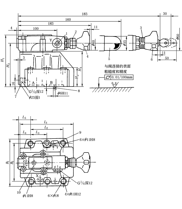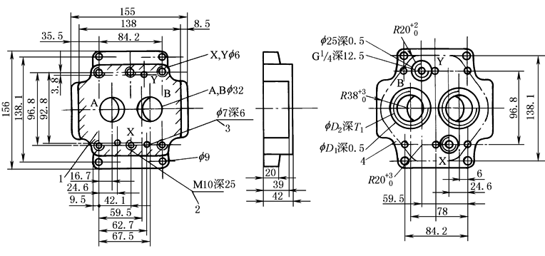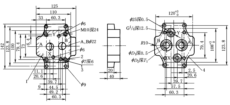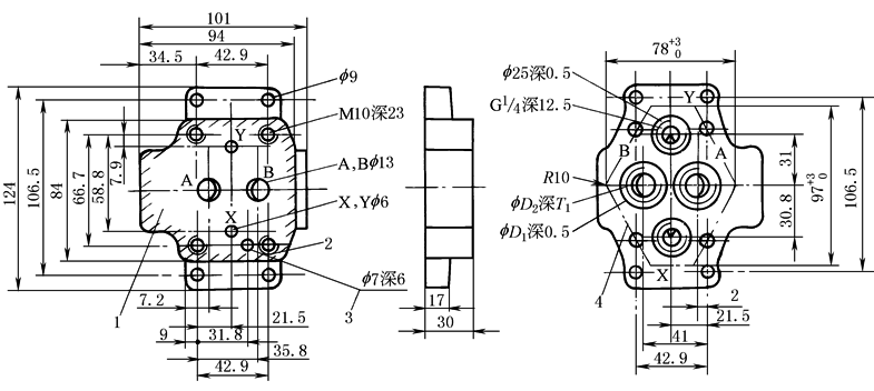 注:图中1—阀的连接面;2—阀的固定螺孔;3—定位销孔;4—安装连接板的切口轮廓。 |