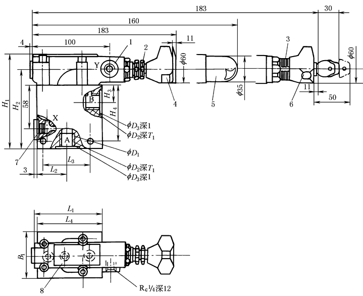 1—Y口(可作控制油回油口或遥控口);2—锁紧螺母(只用于31.5MPa); 3—调节刻度套;4—调节手柄;5—调节装置, 带保护罩;6—调节手柄(带锁); 7—通径10的遥控口(X口);8—标牌 |