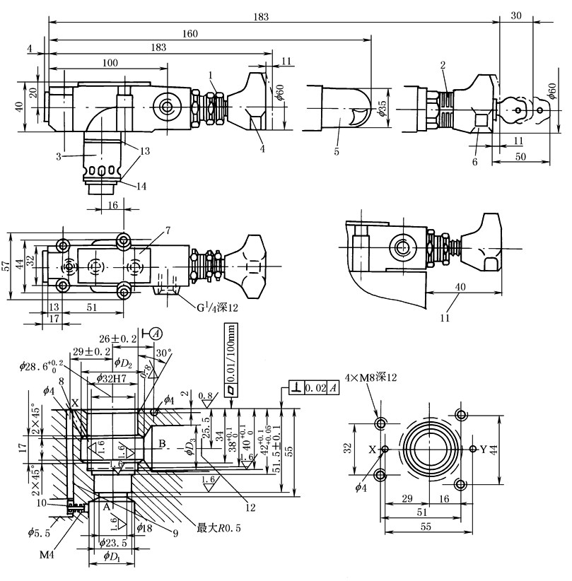 1—锁紧螺母(只用于31.5MPa);2—调节刻度套;3—插入式主阀芯; 4—调节方式“1”;5—调节方式“2”;6—调节方式“3”; 7—标牌;8—通径25和32的控制油进油路; 9—通径10的控制油进油路;10—通径10的阻尼器; 11—使用“1”或“3”调节方式时,距主阀体的最小距离; 12—孔��D3与��D2允许在任何位置相通, 但不能破坏连接螺孔和控制油路X;13—O形圈27.3×2.4; 14—密封挡圈32/28.4×0.8