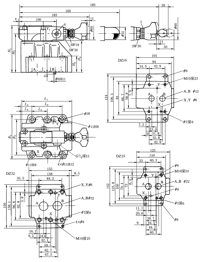 DZ型先导式顺序阀外形及连接尺寸(板式)