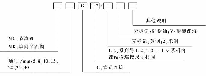 MG/MK型节流阀是直接安装在管路上的管式节流阀/单向节流阀,该阀节流口采用轴向三角槽结构,用于控制执行元件速度。 型号意义: