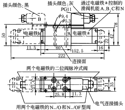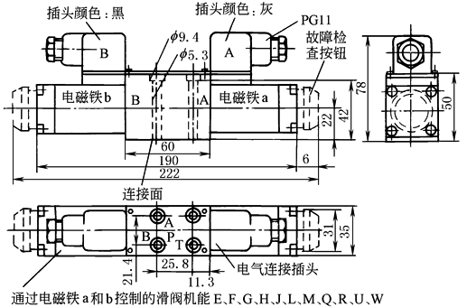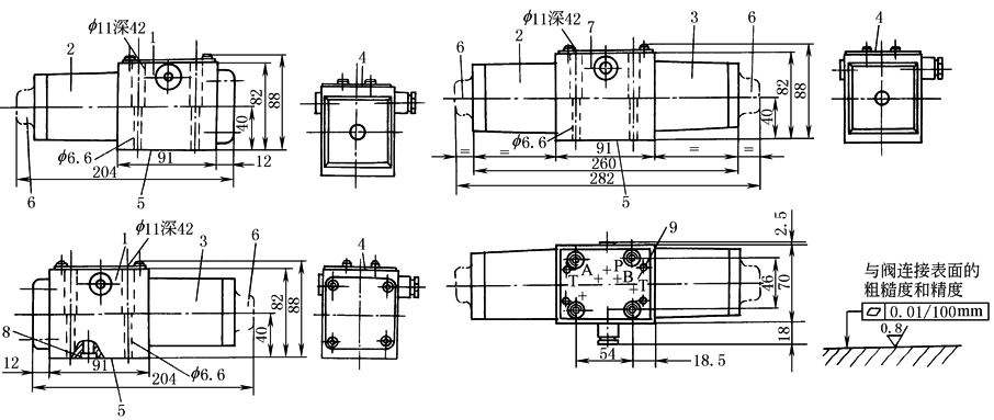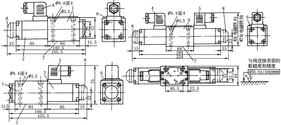1—用1个电磁铁的二位阀;2—电磁铁a;3—电磁铁b;4—标牌;5—连接面;6—故障检查按钮;7—用2个电 磁铁的二位阀和三位阀;8—O形圈12×2;9—附加连接孔T腔可与ZDRD…型减压阀相连接 |