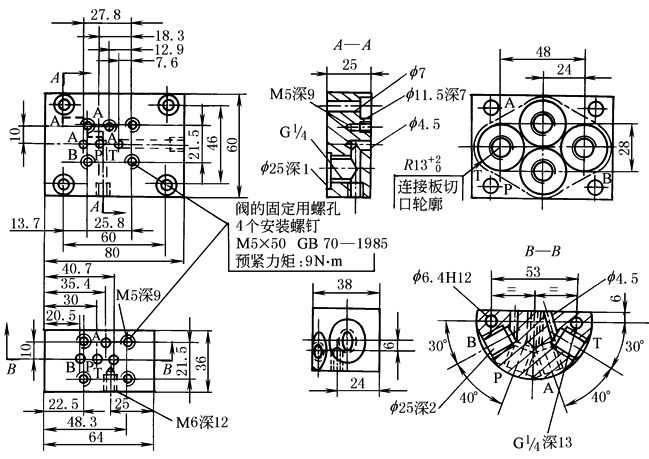 1—阀的连接面; 2—固定连接板的切口轮廓; 3—阀的固定用螺孔; 4—阀固定螺钉4×M5×50,GB/T70.1,转矩9N·m |