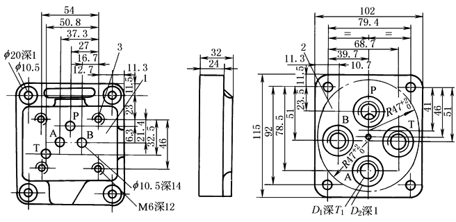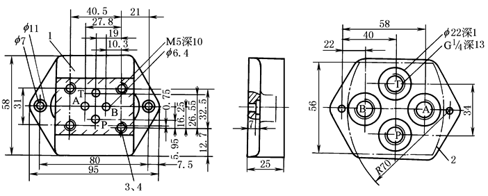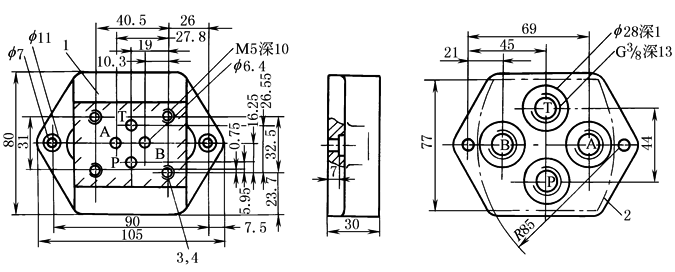 ① 表示如果工作压力超过6MPa,A和B型阀的T腔必须作为泄漏腔使用。 ② 表示E1型机能相当于P→A,B常开,E1和系列之间必须加一横线。 |