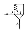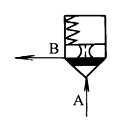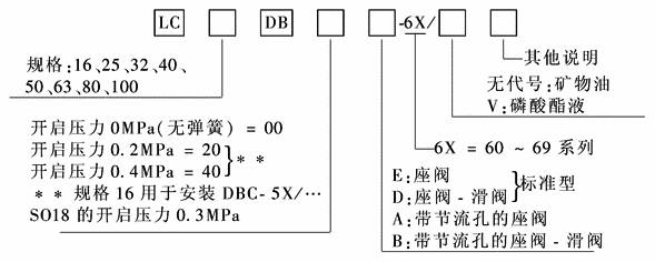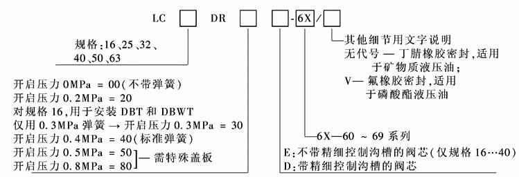 LC…DR…型2通插装阀与(溢流功能所用者相同的)LFA…DB型控制盖板相结合构成常开特性的减压功能 图3 减压插装阀图形符号(常开) ② 常闭特性 型号意义: LFA型控制盖板 |