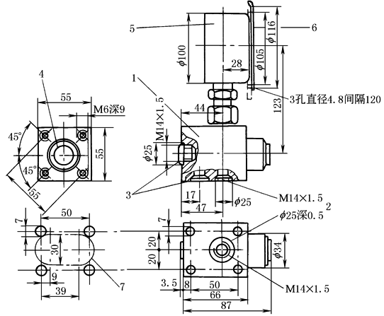 图 AF6型压力表开关外形尺寸 1—压力表开关;2—压力油口(与泵连接);3—回油口,可任选;4—按钮; 5—压力表;6—固定板;7—面板开口 |