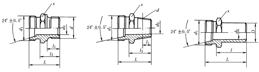 标记示例 1) 公称通径为DN6,连接螺纹d1=M18×1.5的锥密封软管总成旋入端为公制细牙螺纹的锥接头: 锥接头 6-M18×1.5 JB/T 6144.1—2007 2) 公称通径为DN6,连接螺纹d1=M18×1.5的锥密封软管总成旋入端为G1/8圆柱管螺纹的锥接头: 锥接头 6-M18×1.5(G1/8) JB/T 6144.2—2007 3) 公称通径为DN6,连接螺纹d1=M18×1.5的锥密封软管总成锥旋入端为R1/8 管螺纹的锥接头: 锥接头 6-M18×1.5(R1/8) JB/T 6144.3—2007 4) 公称通径为DN6,连接螺纹d1=M18×1.5的锥密封软管总成旋入端NPT1/860°圆锥管螺纹的锥接头: 锥接头 6-M18×1.5(NPT1/8) JB/T 6144.4—2007 5) 公称通径为DN6,连接螺纹d1=M18×1.5的锥密封软管总成焊接锥接头: 锥接头 6-M18×1.5 JB/T 6144.5—2007 mm |