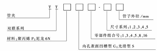 订货代号 TTPG—双联塑料管夹内孔凹槽型 TTPS—双联塑料管夹内孔光滑 TTNG—双联尼龙管夹内孔凹槽型 TTNS—双联尼龙管夹内孔光滑 (根据要求,请调换“订货代号”中的标准缩写“TTPG”部分) |