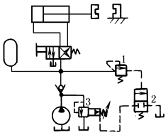 液压夹紧系统中二位四通阀左位接入,工件夹紧,油压升高,通过顺序阀1、二位二通阀2、溢流阀3使油泵卸荷,利用蓄能器供油,保持恒压 |