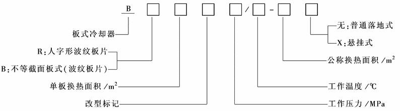 B型板式冷却器以不锈钢波纹板为传热面,它具有高传热系数、体积小、重量轻、组装灵活、拆洗方便等特点 1) 型号意义