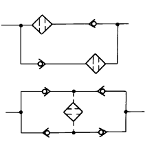 注:由于过滤器只能单方向使用,所以不要安装在液流方向经常改变的油路上。如需这样设置时,应适当加设过滤器和单向阀,如下图a;也可采用图b、c所示的单向过滤器,油液从过滤器进口经滤芯2和回油阀1流到出口;图c为油液反向流动,此时回油阀被液流推向下方,打开从出口直接至进口的通道,同时盖住至滤芯的通道,油液便从过滤器出口不经滤芯直接向进口流去,这样单向过滤器只对正向油液起过滤作用 |