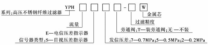 注:1.生产厂为新乡市平菲滤清器有限公司(该厂YPM和YPL系列过滤器产品也可采用不锈钢纤维滤芯)。 2.型号意义:
