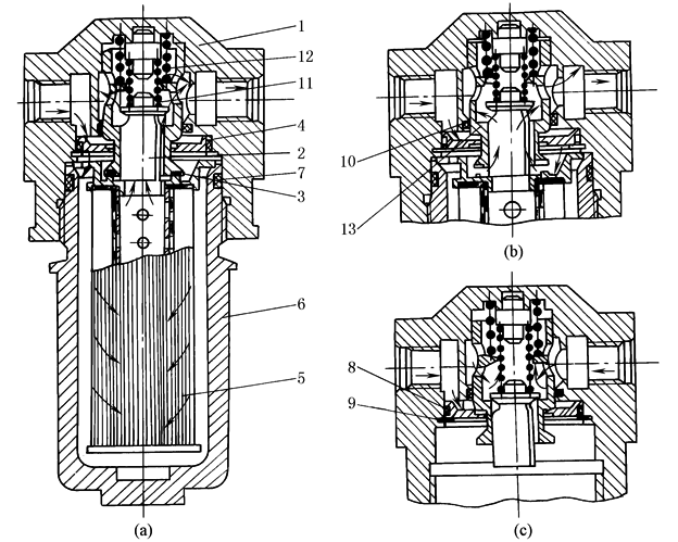 自封式吸油过滤器结构原理 (a)过滤器正常工作状态;(b)过滤器滤芯被污染物堵塞时安全阀开启; (c)更换或清洗滤芯时封闭滤油器上下游的油路 1—上壳体;2—单向阀阀芯;3—安全阀;4—阀座;5—滤芯元件;6—下壳体; 7、8、10—O形密封圈;9—挡圈;11—单向阀弹簧;12—安全阀弹簧;13—安全阀阀体 |
