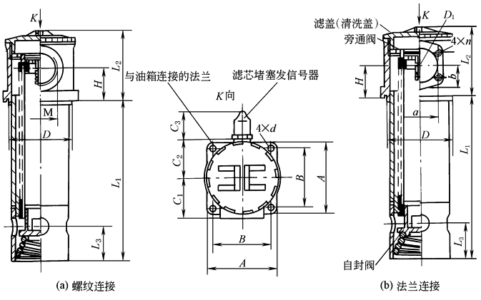 该类过滤器可直接安装在油箱侧边、底部或上部,设有自封阀、旁通阀、压差发信器。当压差超过0.032MPa时,旁通阀会自动开启。更换或清洗滤芯时,自封阀关闭,切断油箱油路
