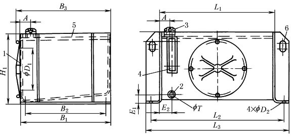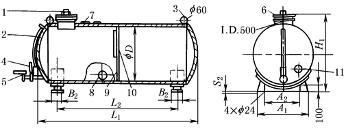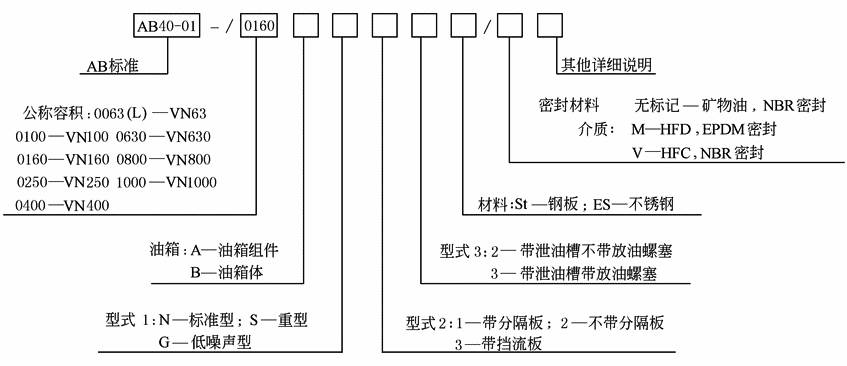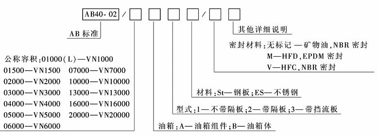 注:AB40-33为不带支撑脚的矩形油箱,AB40-30为带管支撑脚的矩形油箱;其型号标记意义除AB标准处必须分别代之AB40-33或AB40-30外,其他均相同 油箱的规格参数见表1~表4 带支撑脚的矩形油箱