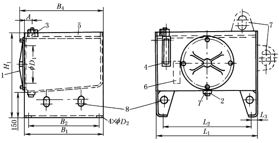 1—清洗用盖;2—放油螺塞;3—注油/滤清器(RE31020);4—液面指示器;5—盛油槽; 6—用于规格1000的第二个液面指示器;7—运输用吊环,根据需要;8—起吊用孔(标准型) |