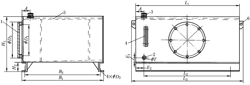 1—注油/滤清器;2—液面指示器;3—运输用吊环;4—龙头;5—放油龙头2″; 6—清洗用盖,任选;7—泄油口1″;8—测试点;9—挡板,任选 |