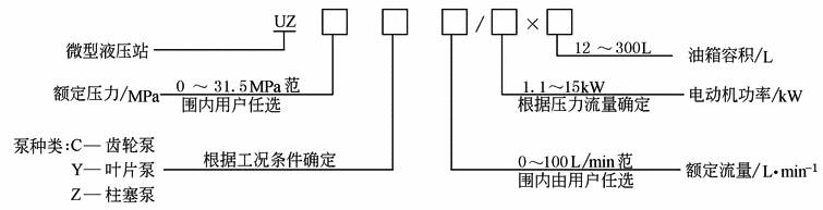UZ系列微型液压站(以下简称UZ站),是由电动机泵组、油箱、液压阀集成块等组成的小型液压动力源。UZ站的电动机全部立式安装在油箱上。UZ站以各种功能螺纹插装阀为主体,兼用各种板式阀和叠加阀,结构紧凑、功能齐全。既有常规液压系统,也有比例和伺服液压系统。既有常规的测量显示仪表,也有压力、流量、油温、液位等传感器,输出模拟量或数字量信号,由智能控制器、单板机或微机实现高精度和远程监控。 UZ系列微型液压站由天津优瑞纳斯油缸有限公司生产 (1) 型号意义